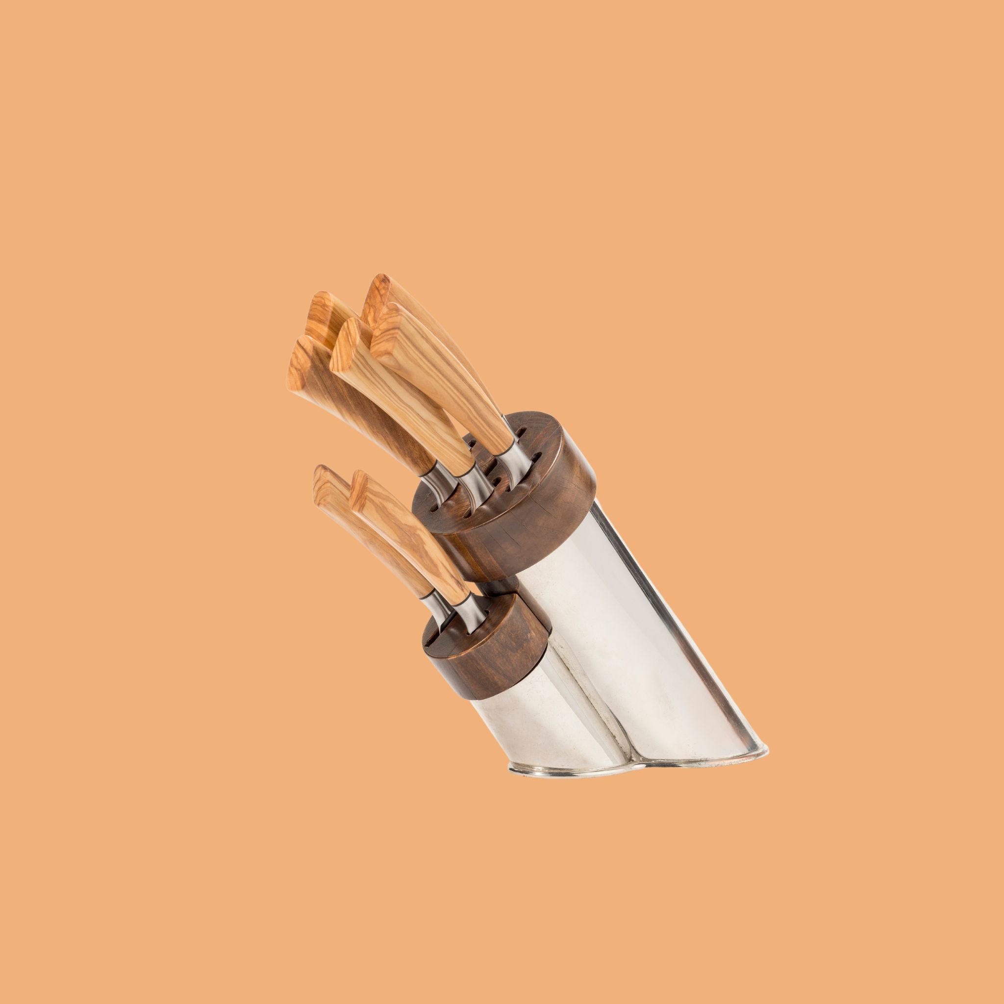 Portacoltelli in ottone naturale, un accessorio elegante e funzionale, disponibile sia con che senza coltelli. Perfetto per aggiungere un tocco di stile alla tua cucina.