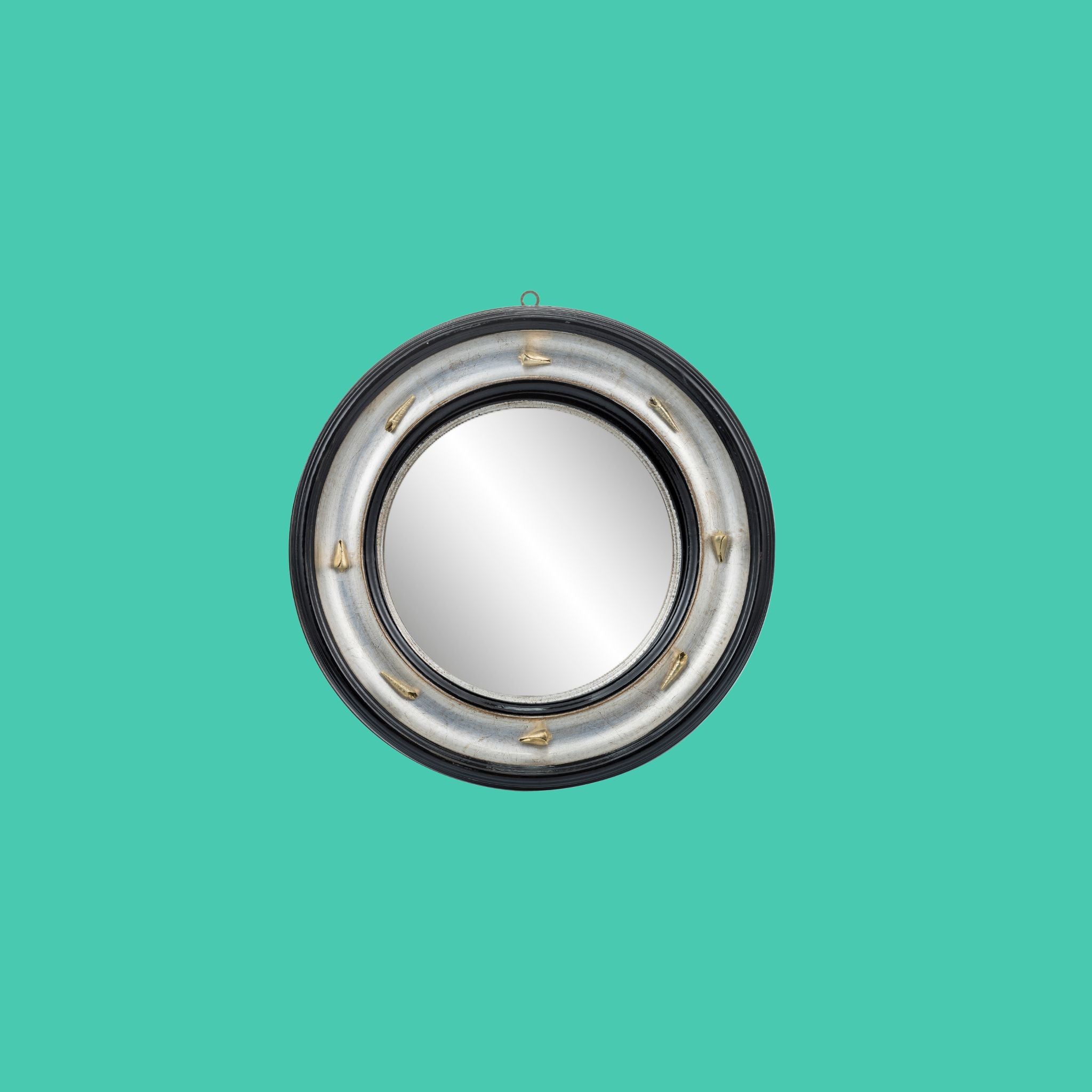 Specchio in legno argentato con decorazione in ottone